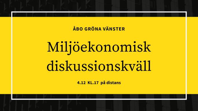 Kommunalvalet närmar sig och många av de aktuella frågorna som kan tänkas intressera väljare berör miljön och ekonomin. Världen står inför en miljökris, och på samma gång finns det många ekonomiska utmaningar i den lokala politiken som ett resultat av Coronapandemin. Alla intresserade är således välkomna att delta i vår miljöekonomiska diskussionskväll imorgon den 4.12 … Fortsätt läsa Mijöekonomisk diskussionskväll imorgon kl.17!