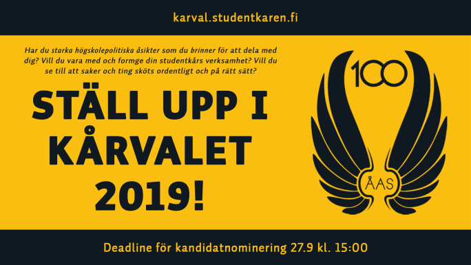 In English Som många av er säkert redan har lagt märke till via våra kanaler på social media, så har ÅGV -grupperingen fyra fantastiska kandidater uppställda i Kårvalet. Undrar du vad kårvalet är? Läs mera om valet genom att klicka här, och om ÅGV -grupperingen genom att klicka här! En närmare beskrivning av varje kandidat … Fortsätt läsa Våra kårvalskandidater och kårvalsdebatten 2019! (our kårval -candidates and a election debate)